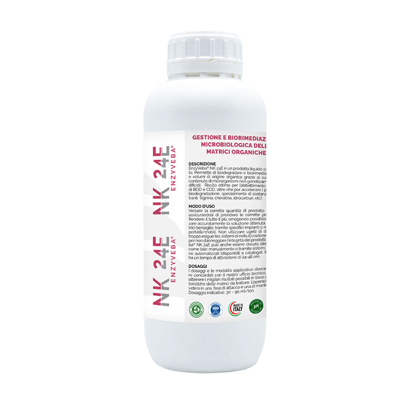 Enzyveba NK24E è un prodotto ecologico e naturale per la degradazione, stabilizzazione, sanificazione biologica, deodorizzazione indotta, di matrici organiche solide e liquide. Liquido contenente una carica microbica rappresentata da ceppi batterici e fungini non geneticamente modificati. I microrganismi agiscono sulle molecole anche complesse costituite con la chimica organica, inorganica e fisica, degradandole e riportandole in positivi cicli naturali.