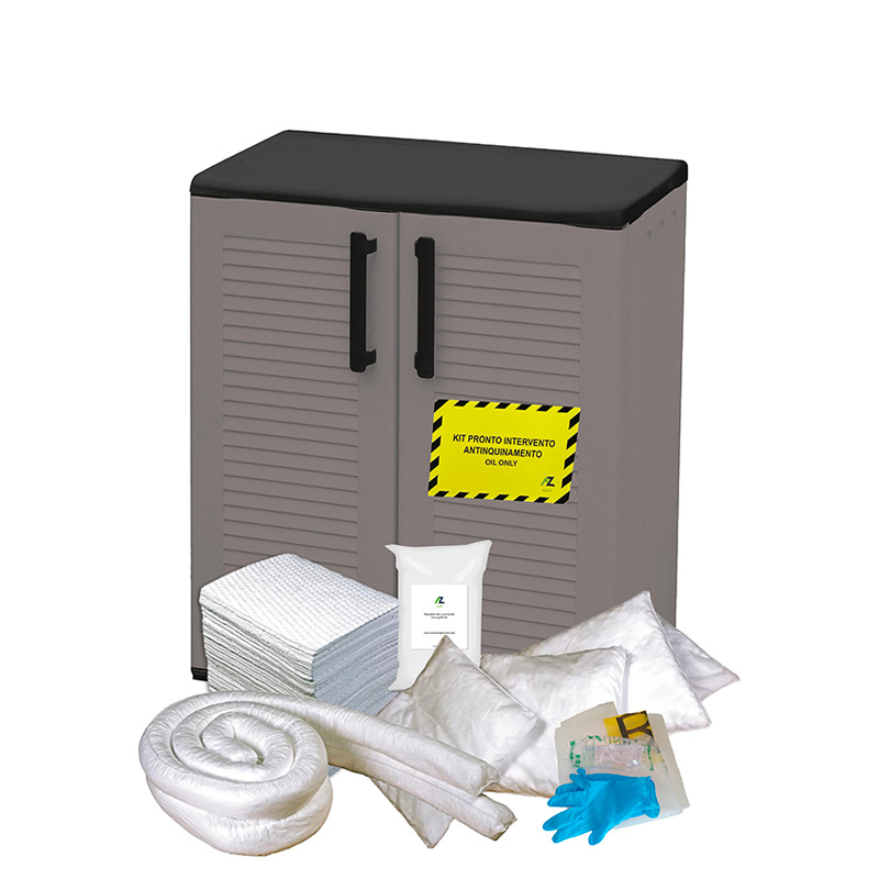 Kit Oil Only in armadio basso a due ante è un comodo kit di pronto intervento ideale per l’assorbimento di oli e idrocarburi. É inoltre provvisto di dispositivi di protezione individuale per agire in sicurezza e di polvere assorbente di origine vegetale.