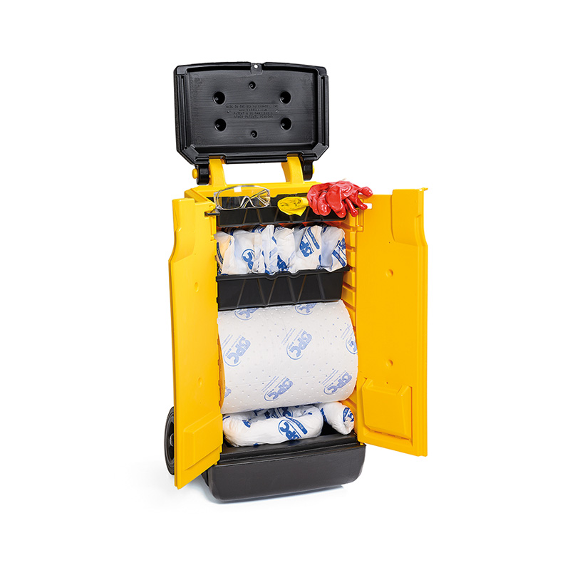 KIT SPILL KADDIE oil only è un armadio carrellatocontenente materiale assorbente per il pronto intervento.E’ pratico e maneggevole per velocizzare le operazioni diassorbimento.